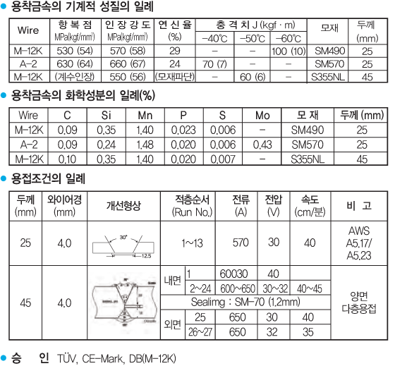 ③ 중, 고전류 용접이 가능하며 모든 두께의 판재에 결쳐 용접성이 양호합니다.