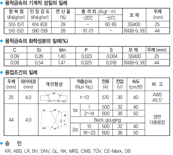 ① 용접조건의 변화에 따라 용접금속의 화학성분이 거의 변하지 않는 비활성계 플럭스로서 특히 중, 후판 중요구조물의 다층용접에 적합합니다.