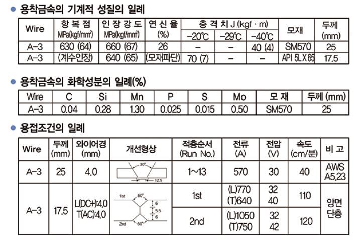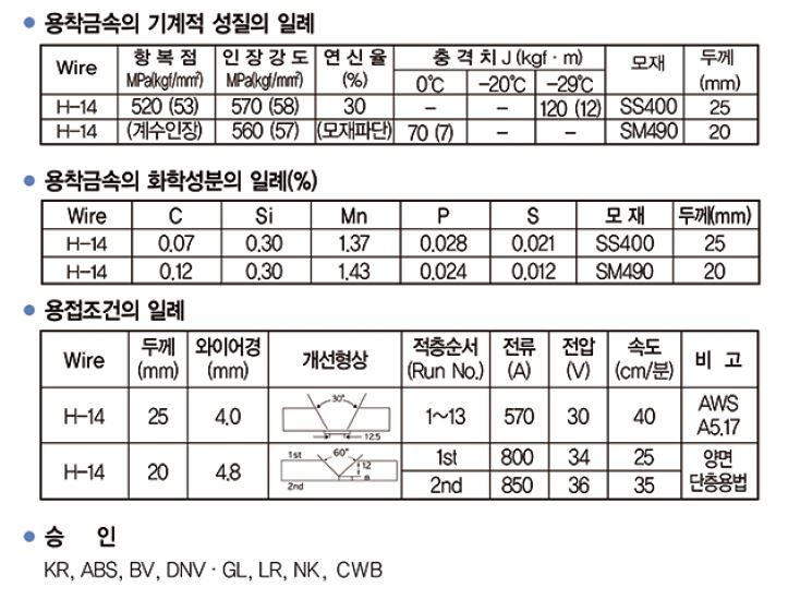 ① 용접조건의 변화에 따라 용접금속의 화학성분이 거의 변하지 않는 비활성계 플럭스로서 저전류 및 중전류에서의 고속 용접성이 양호한 60킬로급 고장력강의 일반구조물 용접용입니다.